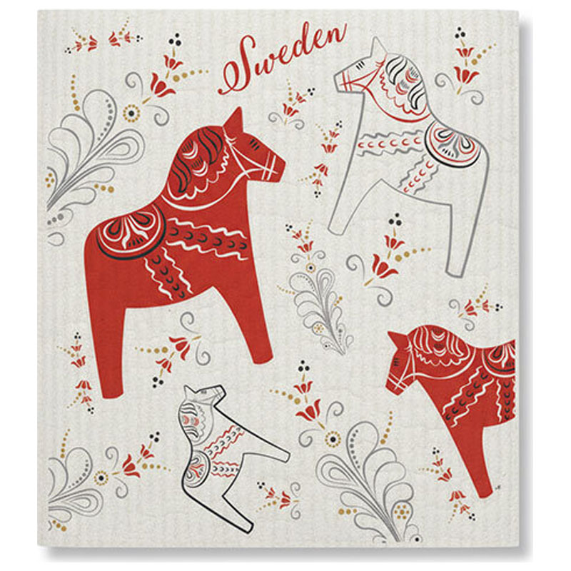 Inbjudande disktrasa från Nordic Souvenir, med motiv av dalahästar i vitt och rött mot en vit botten.