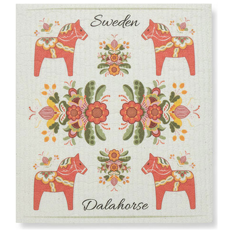 Charmig disktrasa från Nordic Souvenir, med motiv av röda dalahästar och kurbitsblom mot en vit botten.