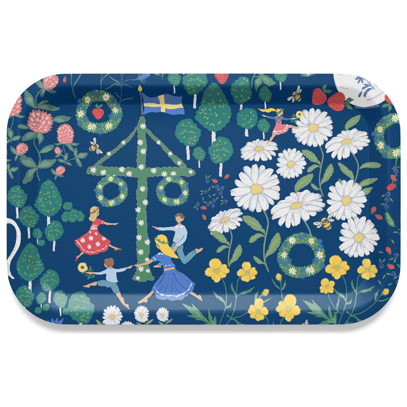 Midsommardans från Arvidssons Textil, vacker bricka med motiv av blommor och växter som speglar klassisk, svensk sommar. I mönstret syns även dans runt midsommarstången.