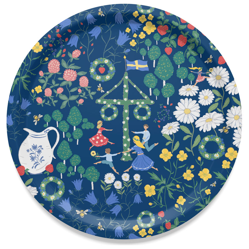 Midsommardans från Arvidssons Textil, vacker, rund bricka med motiv av blommor och växter som speglar klassisk, svensk sommar. I mönstret syns även dans runt midsommarstången.