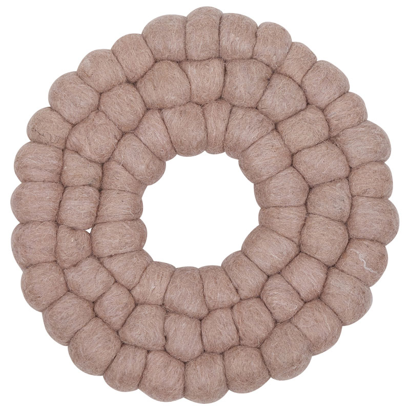 Rulle grytunderlägg i ull, med små filtade bollar i rosa är både en dekorativ och praktisk detalj i köket.