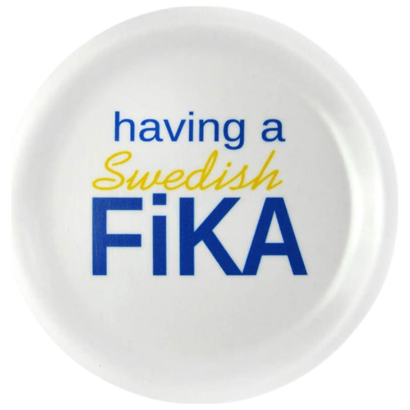 Charmigt glasunderlägg med kant, prydd av texten "having a Swedish fika" i blått och gult mot en vit botten.