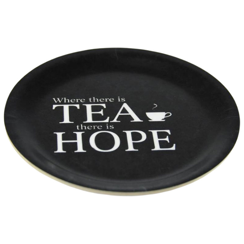 Härligt glasunderlägg med kant, prydd av texten "Where there is TEA there is HOPE" och en tekopp i vitt en svart botten.