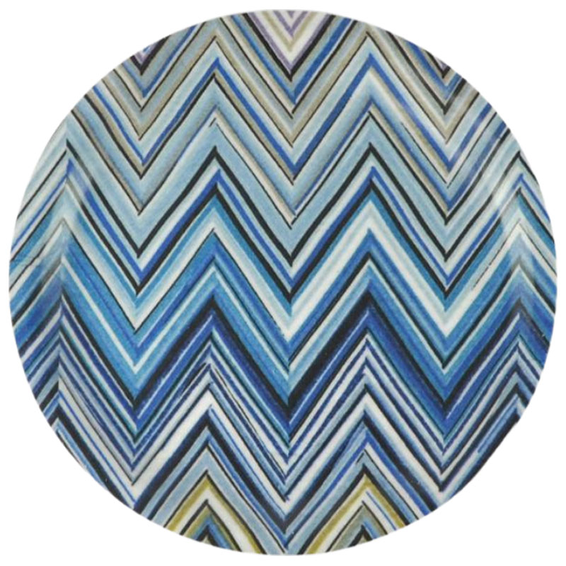 Prydd av ett zig zag mönster i blå, vita och gröna nyanser.