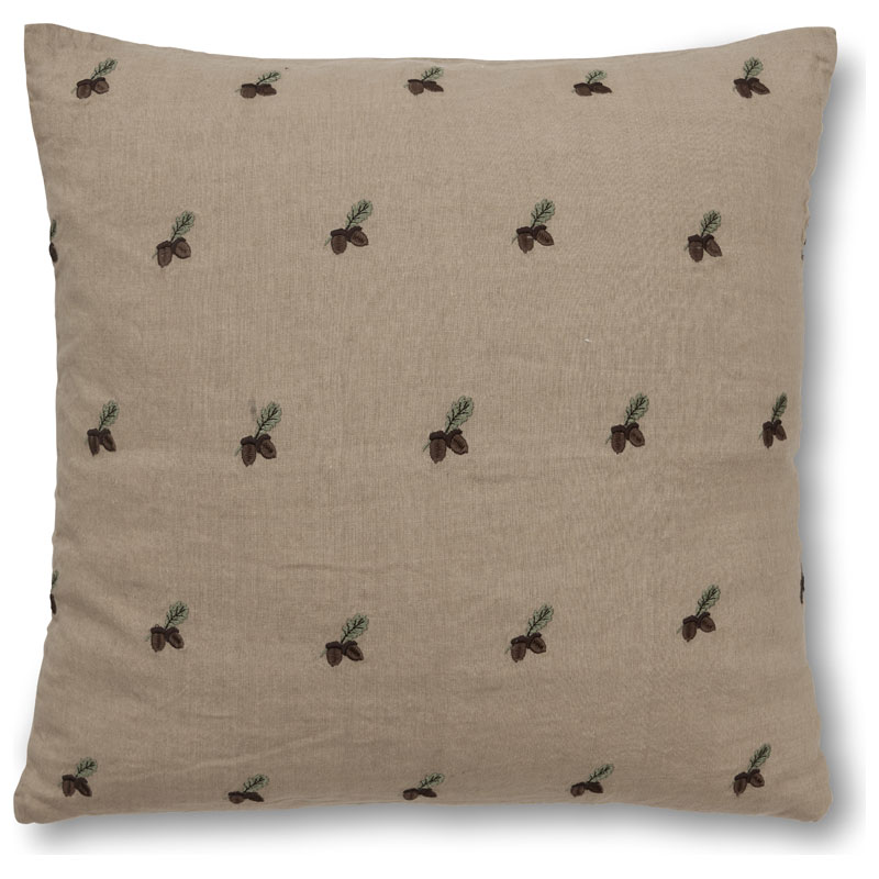 Acorn från Jakobsdals är ett lekfullt och charmigt kuddfodral i en mjuk blandning av linne och bomull, dekorerat med broderade ekollon.
