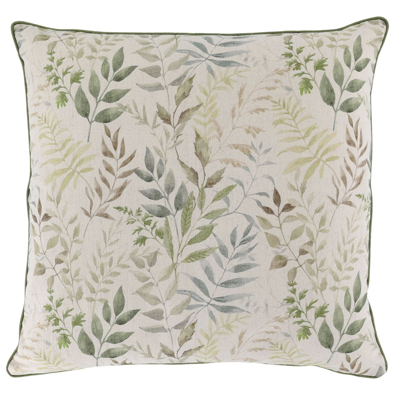Vackert kuddfodral från Chic Antique, prytt av ett bladmönster i gröna, bruna och blå nyanser mot en offwhite botten.