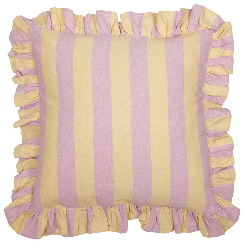 Prydd av fin blockrand i gul och rosa, med en charmig volangkant runtomkring.