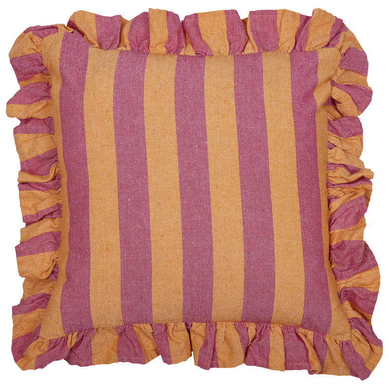 Prydd av fin blockrand i orange och rosa, med en charmig volangkant runtomkring.