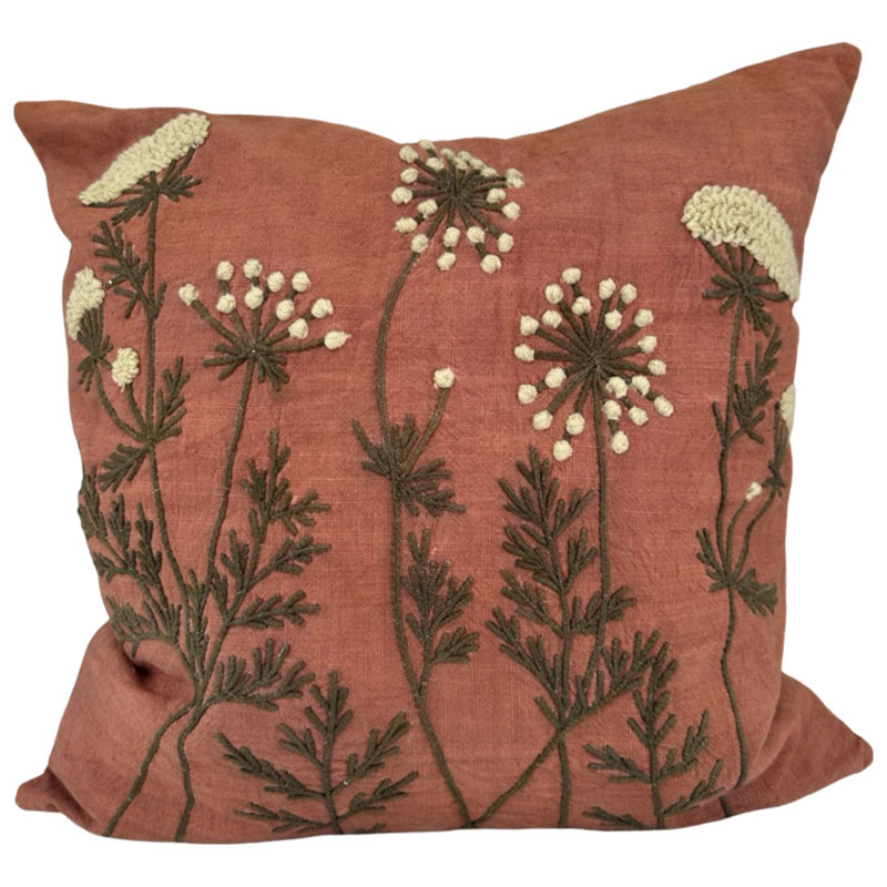 Anthriscus är ett broderat kuddfodral från Miljögården med motiv av små blommor mot en rosa botten.