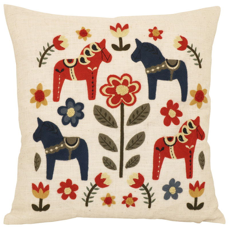 Ett ljuvligt kuddfodral från Redlunds med broderade dalahästar, enfärgad baksida samt dold dragkedja nertill.