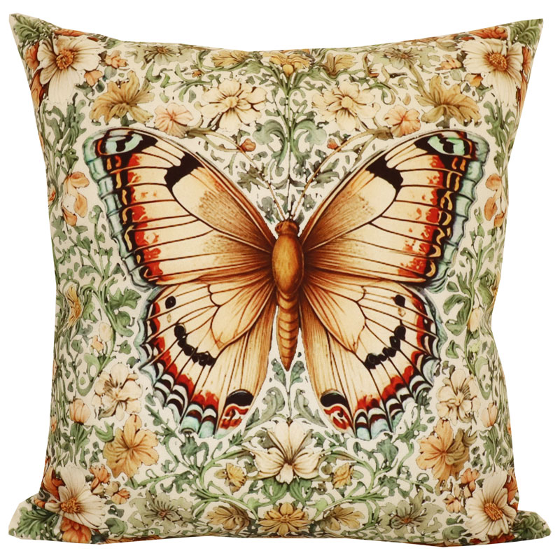 Vackert kuddfodral i sammet från Redlunds, med digitaltryckt motiv av en fjäril i ett hav av blommor.