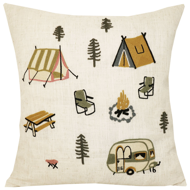 Broderat kuddfodral från Redlunds med tält, granar, en husvagn och en lägereld - såklart! Matcha gärna tillsammans med kuddfodralet som heter Happy camper. Enfärgad baksida, dold dragkedja nertill.