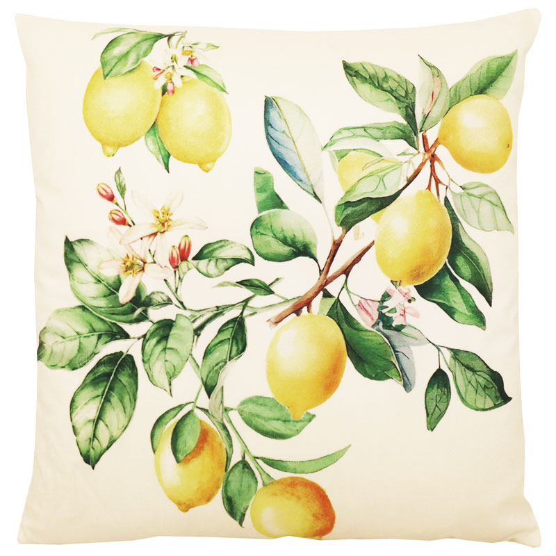 Iögonfallande kuddfodral i sammet från Redlunds, med en digitaltryckt motiv av citroner.