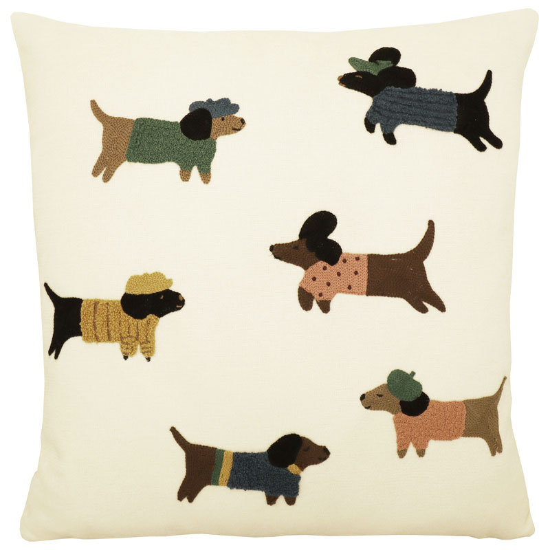 Otroligt gulligt kuddfodral från Redlunds med hundar i coola outfits. Hundarna är broderade på chenille, enfärgad baksida och dold dragkedja nertill.