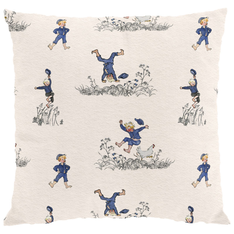 Gulligt kuddfodral från Arvidssons Textil, med motiv av Emil som hoppar glädjeskutt i gräset mot en beige botten.