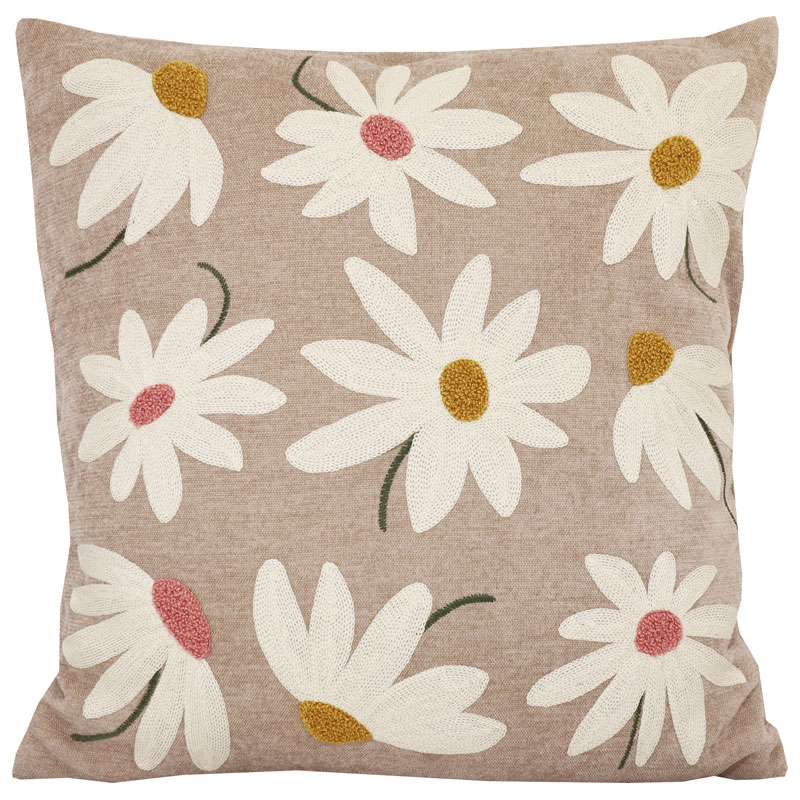 Kuddfodral i chenille från Redlunds med broderade blommor, enfärgad baksida och dold dragkedja nertill.