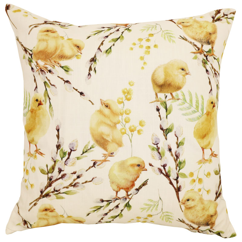 Gulligt kuddfodral i polyester med digitaltryckt mönster av kycklingar och grenar mot en vit botten.