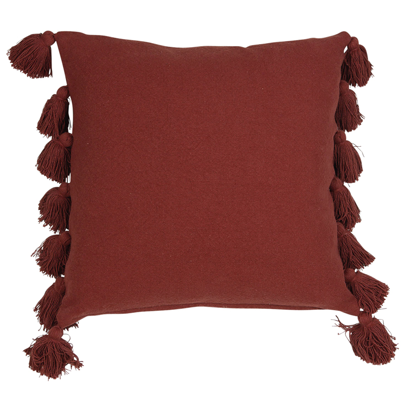 Java från Fondaco, snyggt kuddfodral i tegelfärgat bomull med skrynklad struktur och dekorativa tofsar på sidorna.