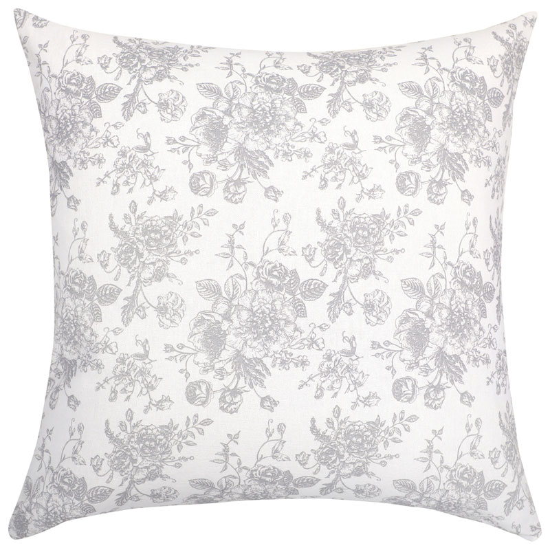 Stiligt kuddfodral av återvunnet material från Classic Textiles. Med ett vackert blommönster i ljusgrått mot en vit botten.