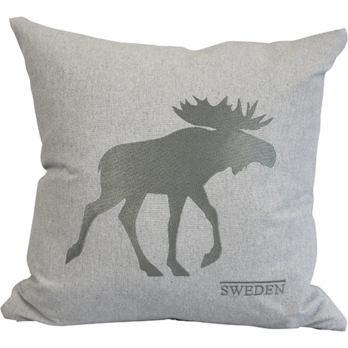 Stilrent kuddfodral från Nordic Souvenir tillverkat av ECO Friendly återvunnet material. Mönster av en fin Älg och ordet SWEDEN.