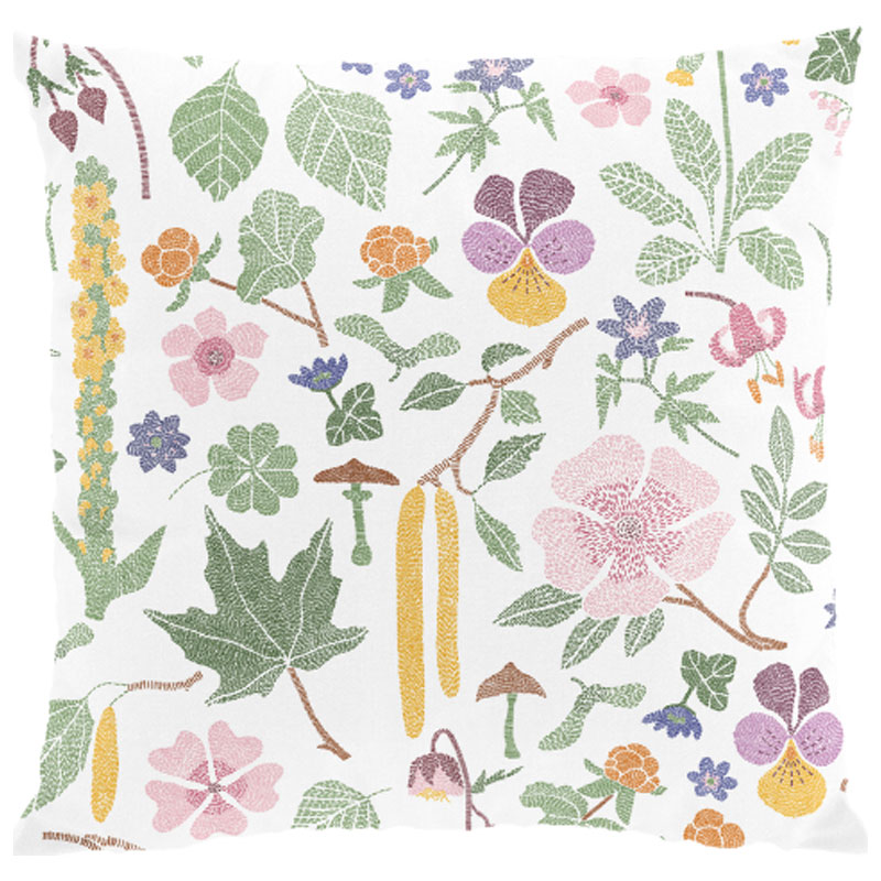 Prydd av ett iögonfallande mönster fyllt av blommor, växter och blad i ljusa nyanser, mot en vit botten.