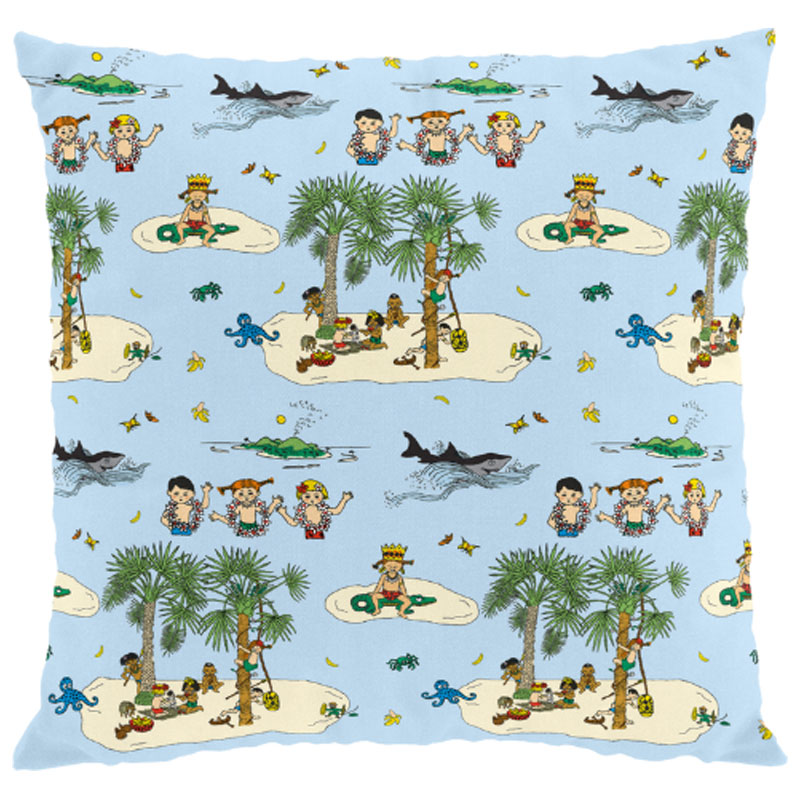 Lekfullt kuddfodral från Arvidssons Textil, med mönster av Pippi, Tommy och Annika ute på äventyr vid Kurrekurreduttön.