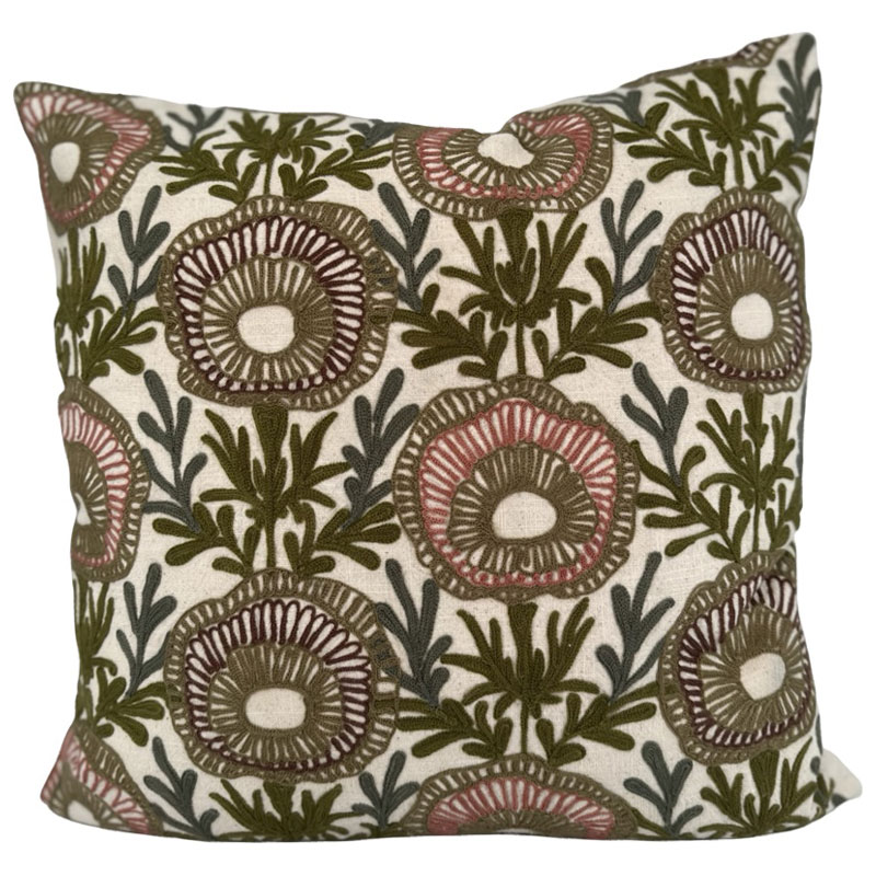 Lamellifolia är ett vackert broderat kuddfodral med blommönster i dova nyanser mot en naturfärgad botten.