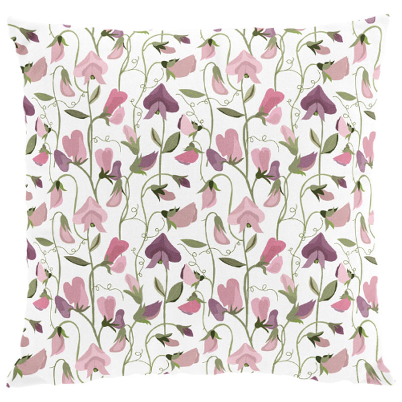 Luktärt är ett vackert kuddfodral från Arvidssons Textil, med ett rosa blommönster mot en vit botten.