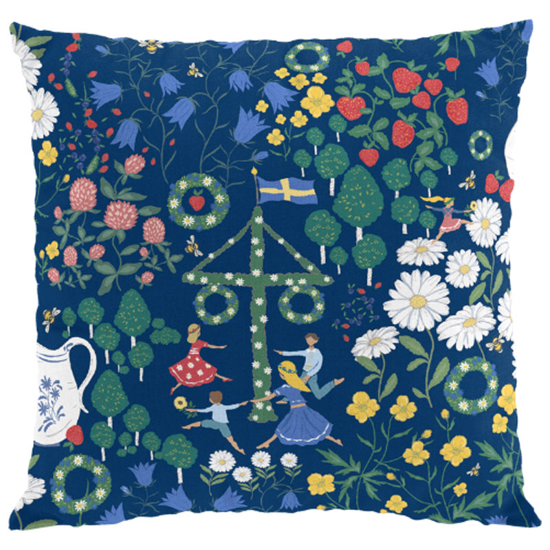Midsommardans är ett charmigt kuddfodral med motiv av olika blommor och växter som speglar klassisk, svensk sommar.