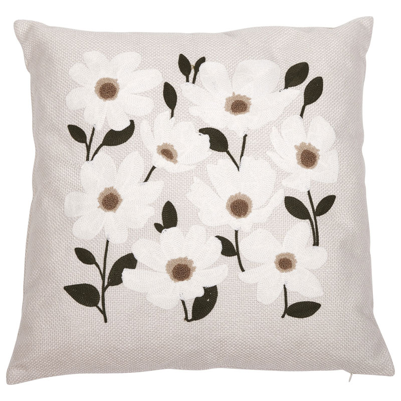 Med en offwhite botten som prydd av broderade blommor i vackra, neutrala färger.