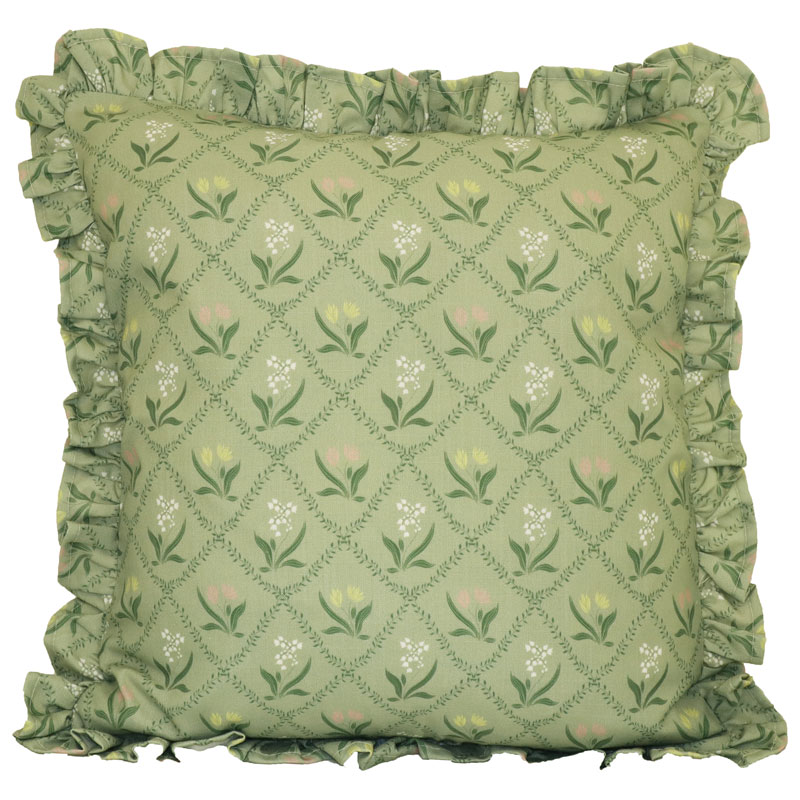 Vackert kuddfodral med digitaltryck från Redlunds. I slub kvalitet med en läcker volang runt om. Enfärgad baksida och en dold dragkedja nertill.