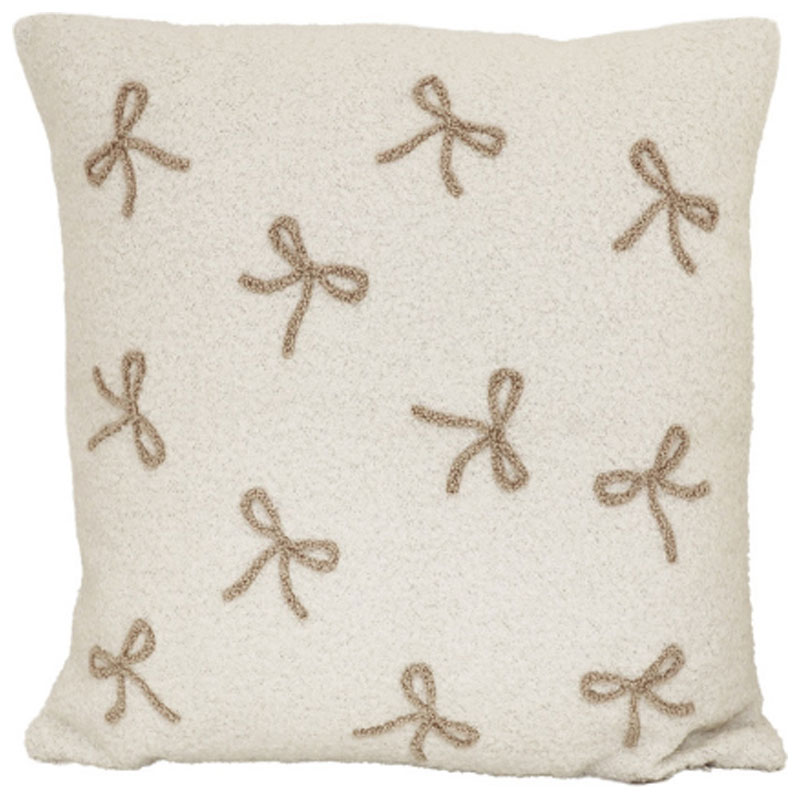 Trendigt kuddfodral i offwhite teddymaterial med broderade, beige rosetter på framsidan.