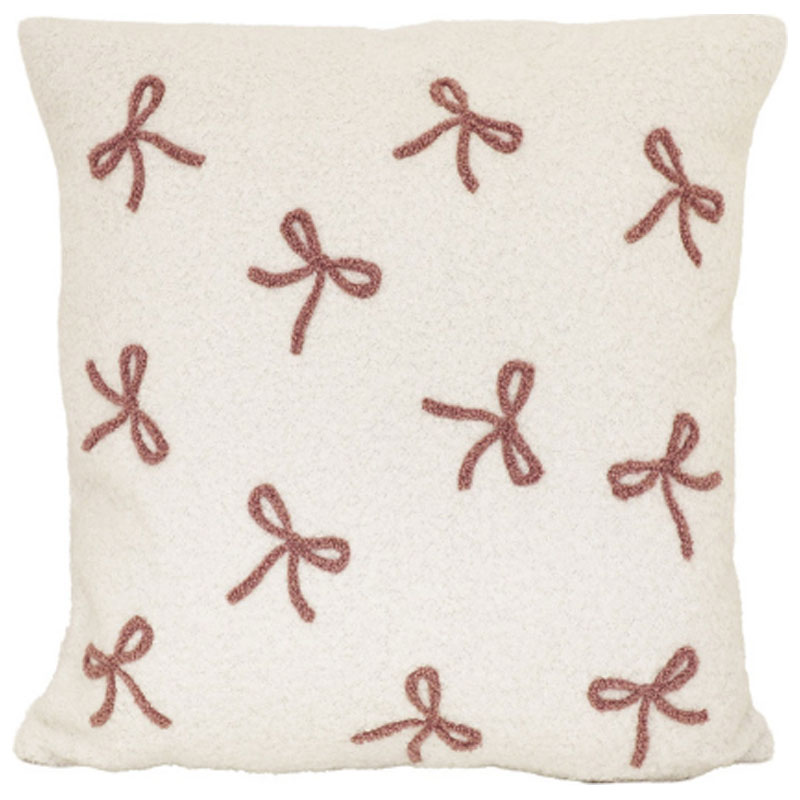 Trendigt kuddfodral i offwhite teddymaterial med broderade, rosa rosetter på framsidan.