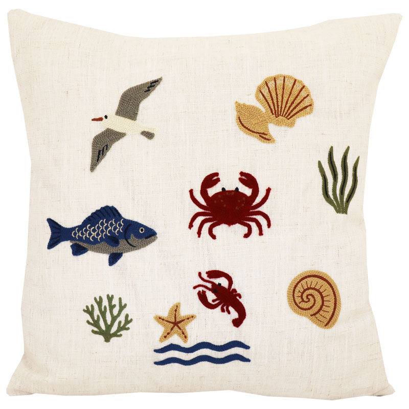 Ett kuddfodral med broderade motiv som är inspirerade utav livet vid havet från Redlunds. En Sommrig inredningsdetalj.