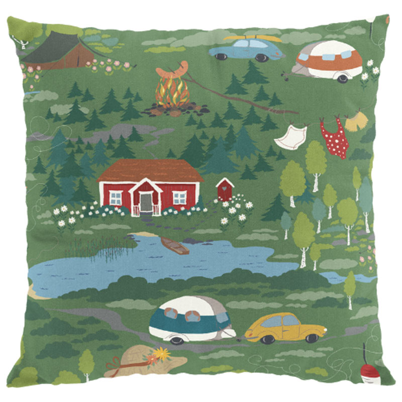 Underbart kuddfodral från Arvidssons Textil, med motiv av olika semester platser och aktiviteter mot en grön botten.