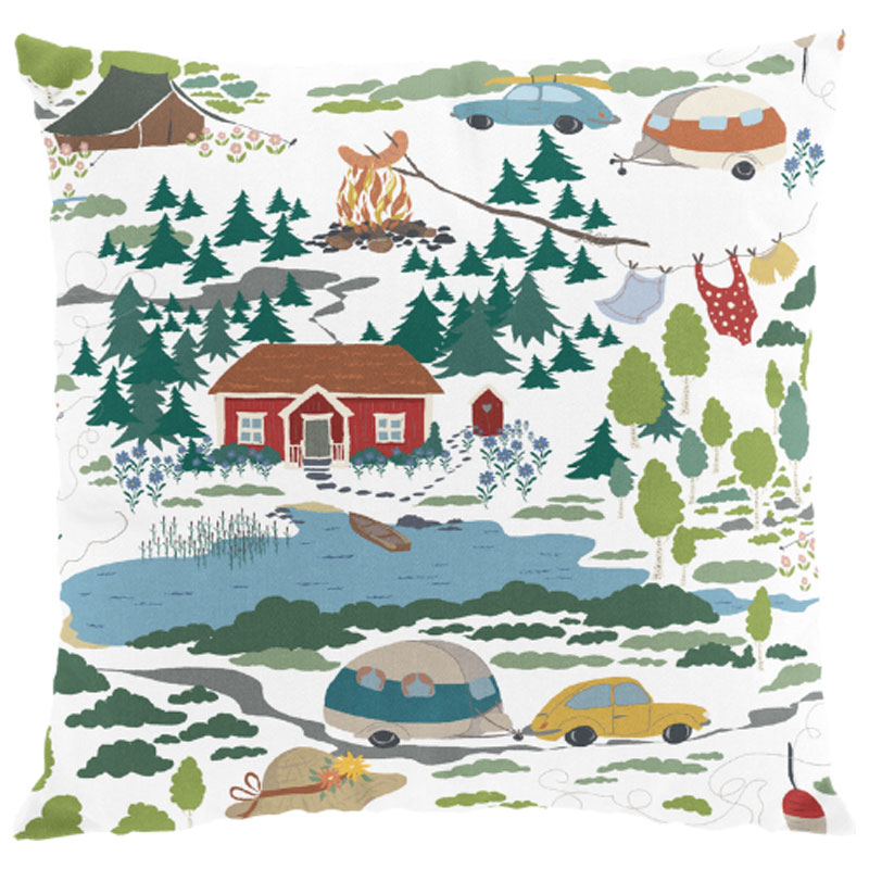 Underbart kuddfodral från Arvidssons Textil, med motiv av olika semester platser och aktiviteter mot en vit botten.