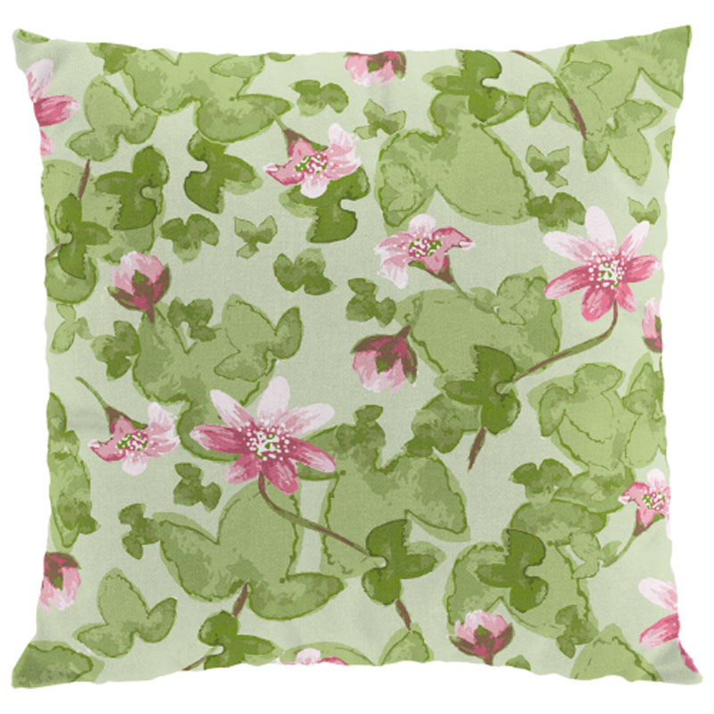 Vackert kuddfodral från Arvidssons Textil, med en gulligt blommönster i rosa mot en grön botten.