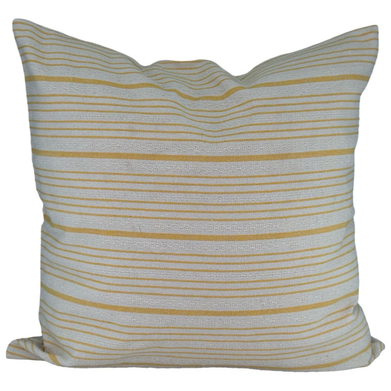Striva är ett gulrandigt kuddfodral med en linne/naturfärgad botten.