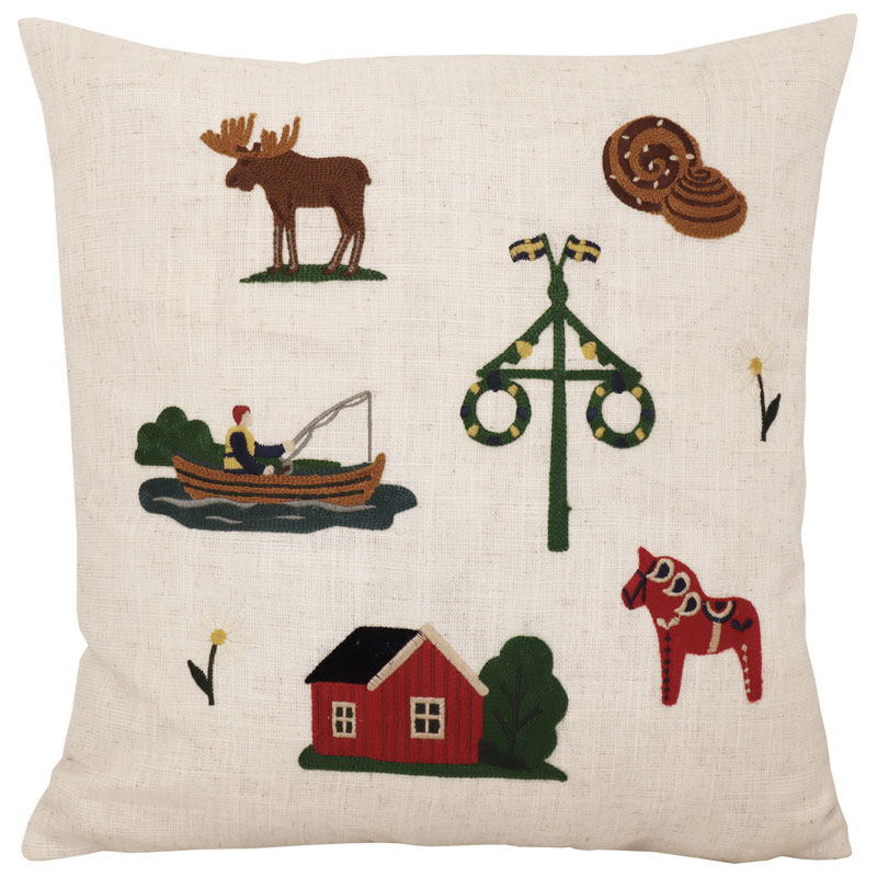 Fint kuddfodral med broderade motiv i en härlig kompott från Redlunds.