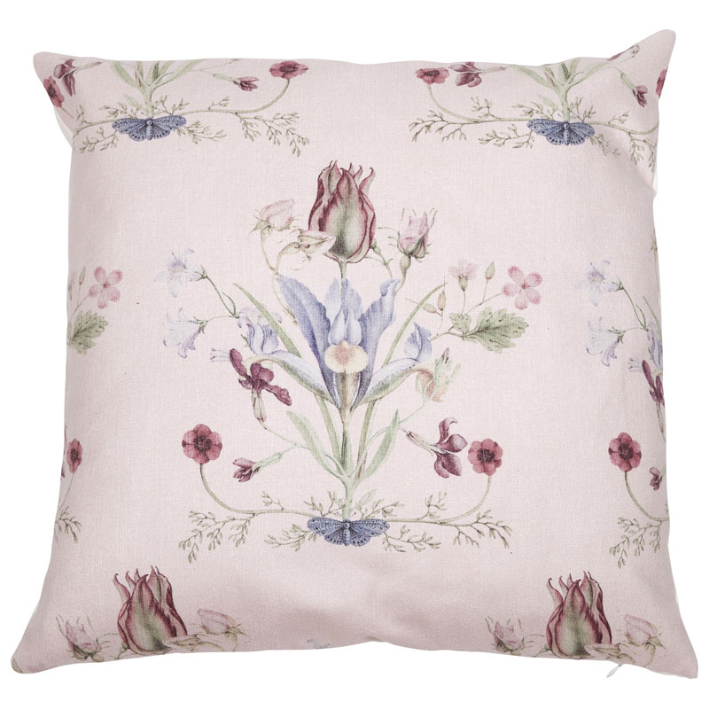 Vendela är ett charmigt kuddfodral, med romantiskt blommönster på framsidan mot en rosa botten.