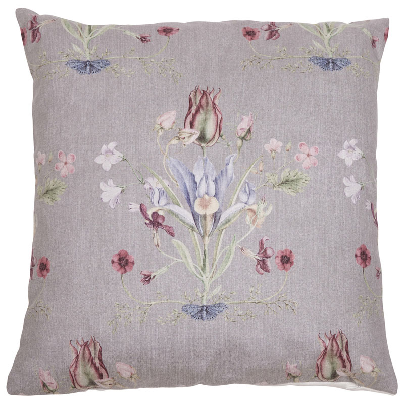 Vendela är ett charmigt kuddfodral, med romantiskt blommönster på framsidan mot en sandfärgad botten.