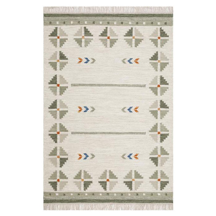 Tålig matta i ull- och bomullsmix från KM Carpets som är handvävd med röllakanteknik med röllakansinspirerat mönster. Mattans botten är cremefärgad och mönster och bård är färgade i härliga, gröna toner.
