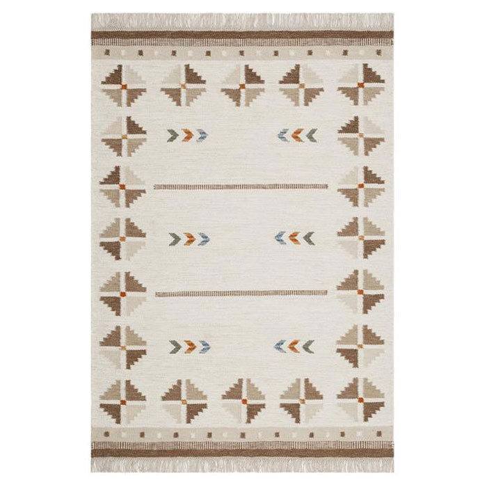 Tålig matta i ull- och bomullsmix från KM Carpets som är handvävd med röllakanteknik med röllakansinspirerat mönster. Mattans botten är cremefärgad och mönster och bård har en ljus och en mörk sandfärgad nyans.