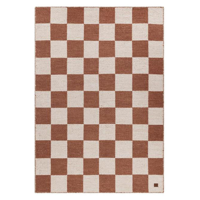 Det terracotta melerade och det naturvita garnet som tillsammans bilder ett häftigt rutigt mönster som gör denna mattan till en fröjd för ögat. En vacker och tidlös matta som kommer att kunna njutas av länge tack vare ullens alla fördelar.
