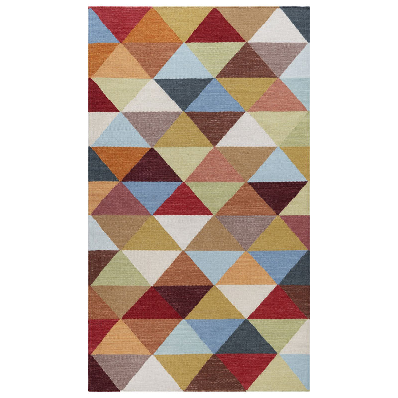 Electra Kon från KM Carpets är en färgstark, handvävd matta i 100% ull, där trianglar i dova, mörkare nyanser bildar ett levande mönster.