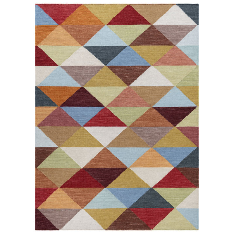 Electra Kon från KM Carpets är en färgstark, handvävd matta i 100% ull, där trianglar i dova, mörkare nyanser bildar ett levande mönster.
