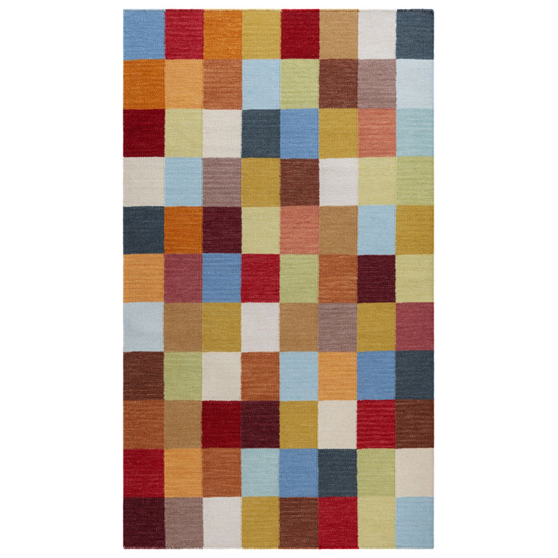 Electra Square från KM Carpets är en färgstark, handvävd matta i 100% ull, där kvadrater i dova, mörkare nyanser bildar ett levande mönster.