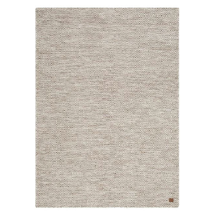 Gåsöga från KM Carpets, handvävd matta i ull- och bomullsmix med ett gåsögemönster som går i två färger - ett brunt garn med ljust linnefärgade inslag blandas med ett naturvitt garn som utgör det rutiga mönstret.