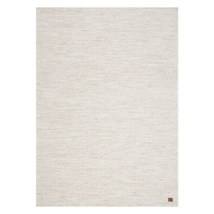 Gåsöga från KM Carpets, handvävd matta i ull- och bomullsmix med ett gåsögemönster som går i två färger - ett naturfärgat garn med inslag av sandiga, ljusa toner blandas med ett naturvitt garn som utgör det rutiga mönstret.