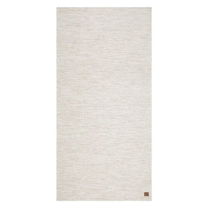 Gåsöga från KM Carpets, handvävd matta i ull- och bomullsmix med ett gåsögemönster som går i två färger - ett naturfärgat garn med inslag av sandiga, ljusa toner blandas med ett naturvitt garn som utgör det rutiga mönstret.